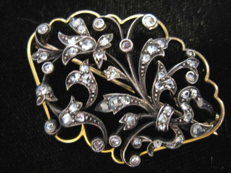 Rose cut diamond in silver freeform brooch, Georgian style, framed by simple yellow gold frame.