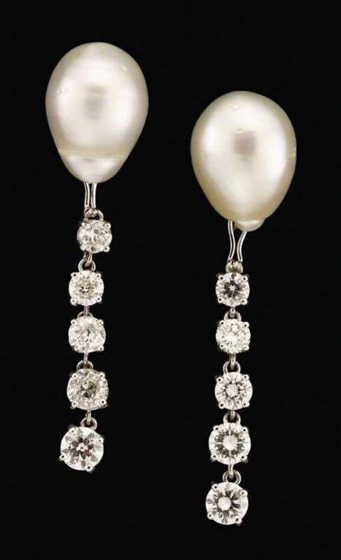 Pair of white gold, baroque pearl, and diamond drop earrings