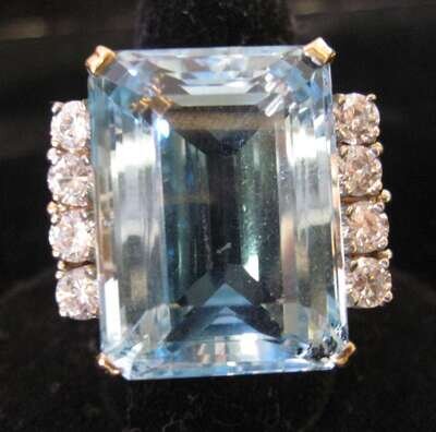 Large cocktail ring with emerald cut synthetic aquamarine, framed on either side by round cut cubic zirconia.