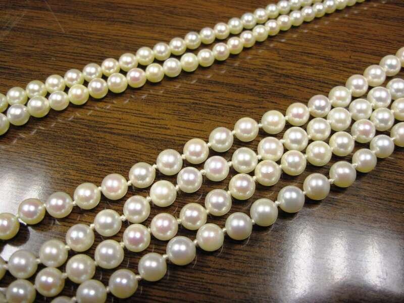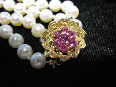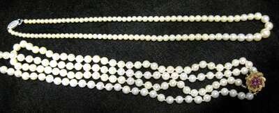 Composed of sixty-three 5.5 mm cultured pearls, yellow gold and "ruby" cluster clasp, L. 16 in., together with a graduated cultured pearl necklace with white gold clasp, 2 pcs.