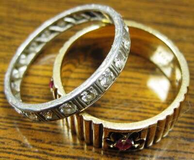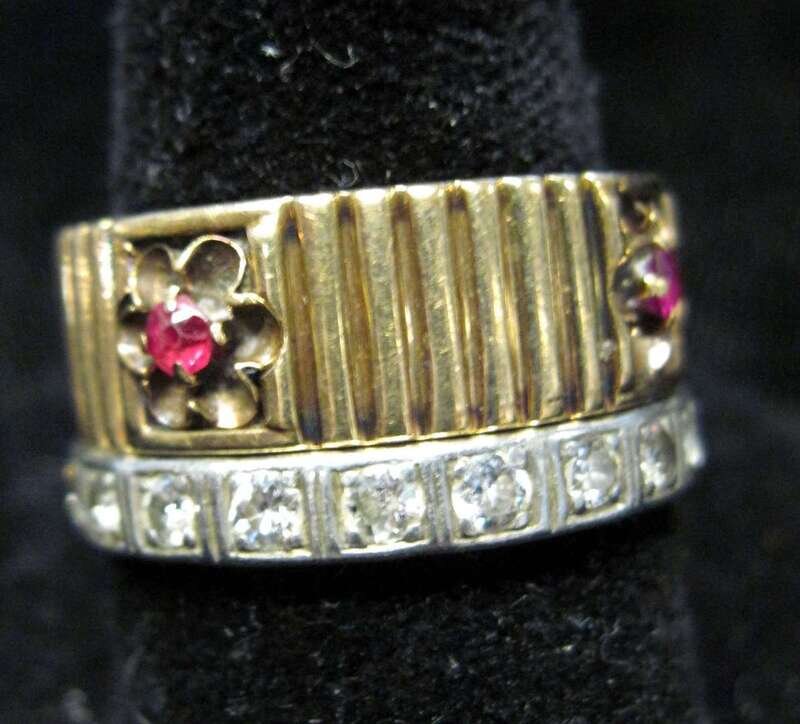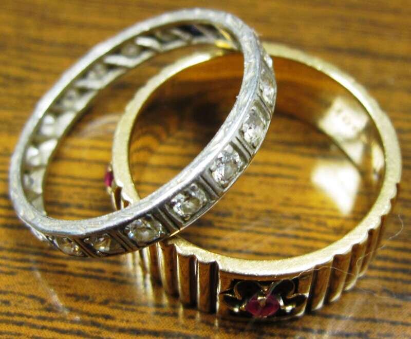 Including one 14 karat ring with rubies, Size: 6 1/2; one diamond band ring with platinum setting.