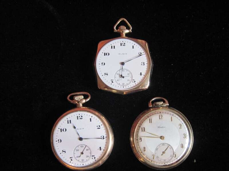 Elgin, black on white Arabic numeral dial with subsidiary seconds dial, Elgin, square case, black on white Arabic numeral dial with subsidiary seconds dial, No. 24503303 and Rescton, gold on "silvered" Arabic numeral dial with subsidiary seconds dial.