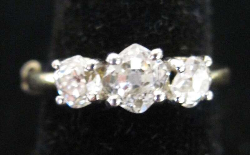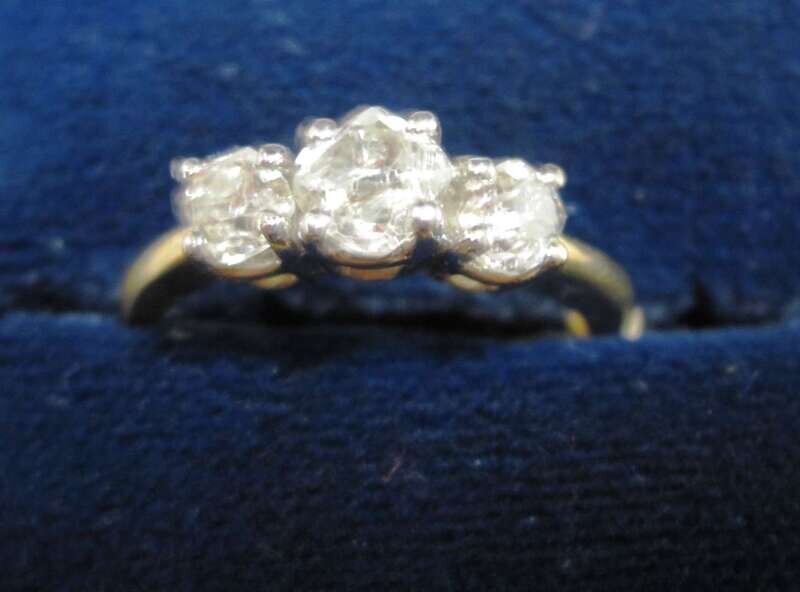 Center round diamond about .25 carat flanked by two .15 carat diamonds.
