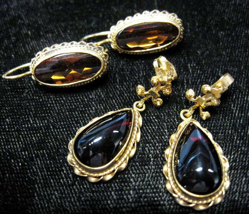 Together with a pair of pear shaped garnet earrings also in 14 karat yellow gold rope twist setting, post backing.