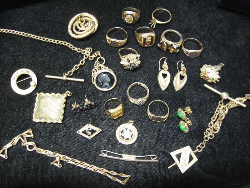 Including rings, pins, cuff links etc., mostly 14 karat with a total wight of 74 dwt, 21 pcs., together with five pieces, chain, class rings and tie bar, 5 pcs.