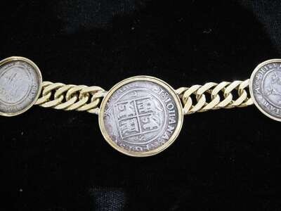 Displaying seven bezel set silver coins of varying sizes together with matching 18 karat yellow gold bezel set coin earrings.