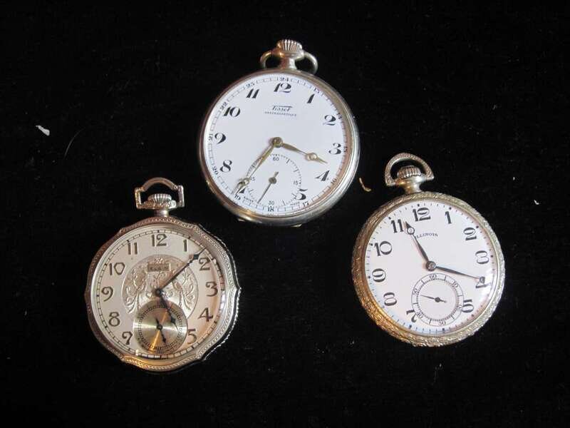 Illinois, black on white Arabic numeral dial with subsidiary seconds dial, cabochon "sapphire" to stem, No. 3051741, Tissot, black on white Arabic numeral dial with subsidiary seconds dial and Elgin, circular serpentine case, gold Arabic numeral on silvered face dial with subsidiary seconds dial, No. 31352398.