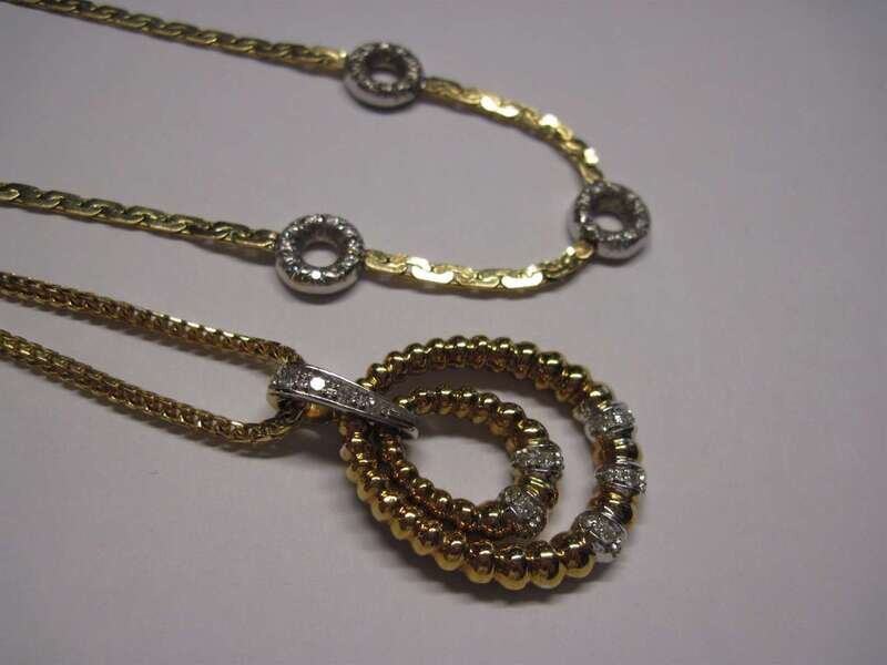 One with oval diamond set pendant, the other displaying three diamond set circle links.