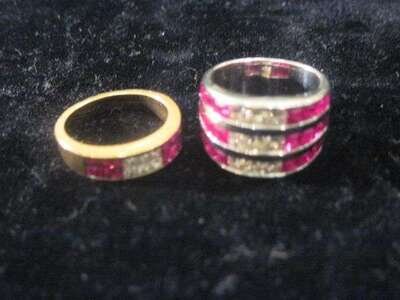 Larger band of 18 karat white gold with ruby and diamond accent, the other more petite 18 karat yellow of ruby and diamond band form.
