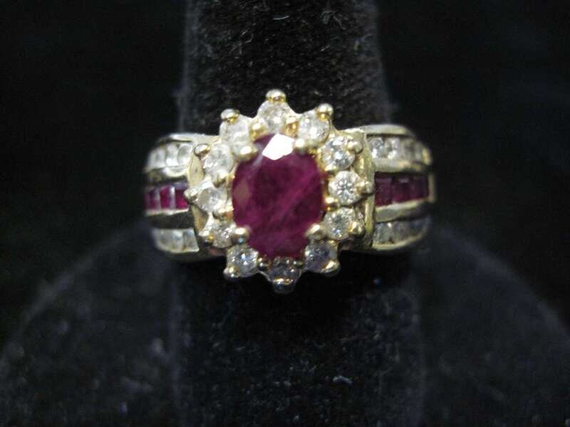 Including one ruby and diamond yellow gold ring, one synthetic sapphire and diamond ring, one citrine ring and one amethyst ring.