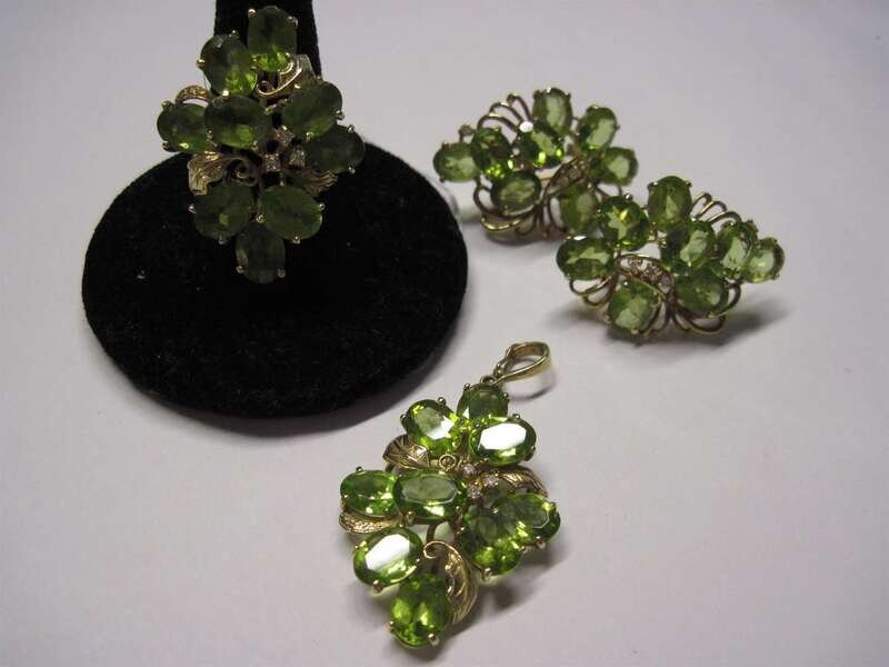 Including a ring and pendant with nine oval olivines and a pair of earrings with eight peridot in each. All pieces set with three single cut diamonds each.