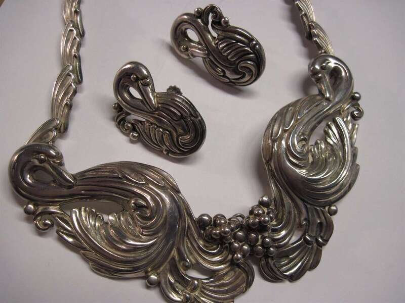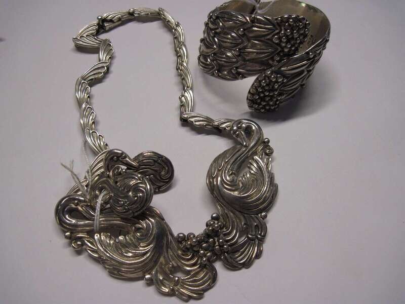 Including a wide hinged bangle and a "swan" necklace with matching earrings, 4 pcs. necklace.