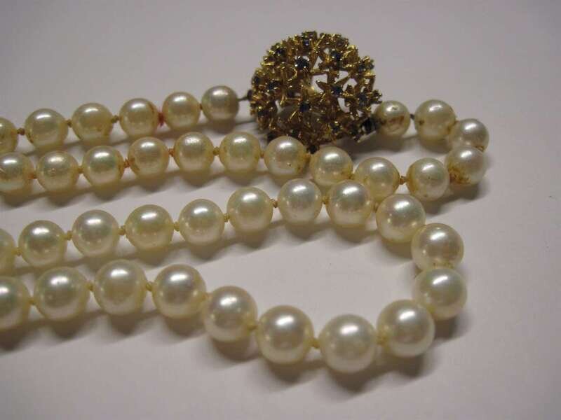 Composed of one hundred and one 6.5 mm cultured pearls with a round openwork hemispheric yellow gold clasp set with petite sapphire chips.