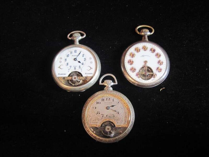 Bonheur with decorative gold on purple Arabic numeral dial, Windsor Exhibition 8 day travel watch with oval black on silver Arabic numeral dial and Exhibition 8 day travel watch with circular black on white Arabic numeral dial.