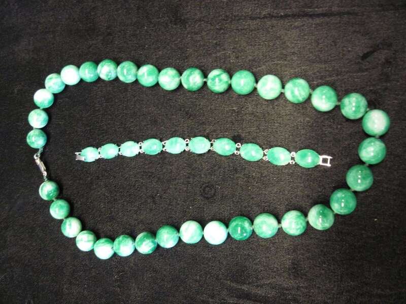 14mm carved jade beads, with 14 karat white gold bracelet displaying oval cabochon carved jade.