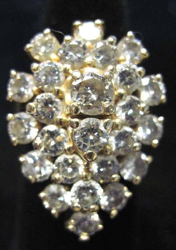 Pear shaped cluster displaying twenty-three petite .15 carat round cut diamonds and a single .30 carat diamond in the center, 14 karat yellow gold setting.