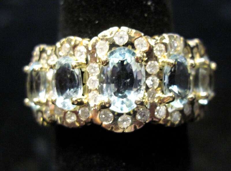 14 karat yellow gold displaying five oval cut aquamarine and framed by petite round cut diamonds.