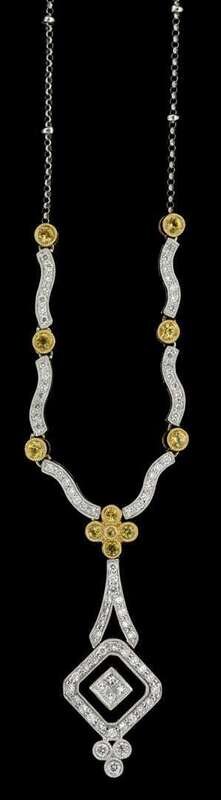 Unusual diamond shaped onyx and diamond set pendant, accented by petite round cut white and yellow diamonds.