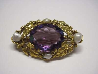 Oval amethyst and yellow gold and baroque pearl pin 20th century