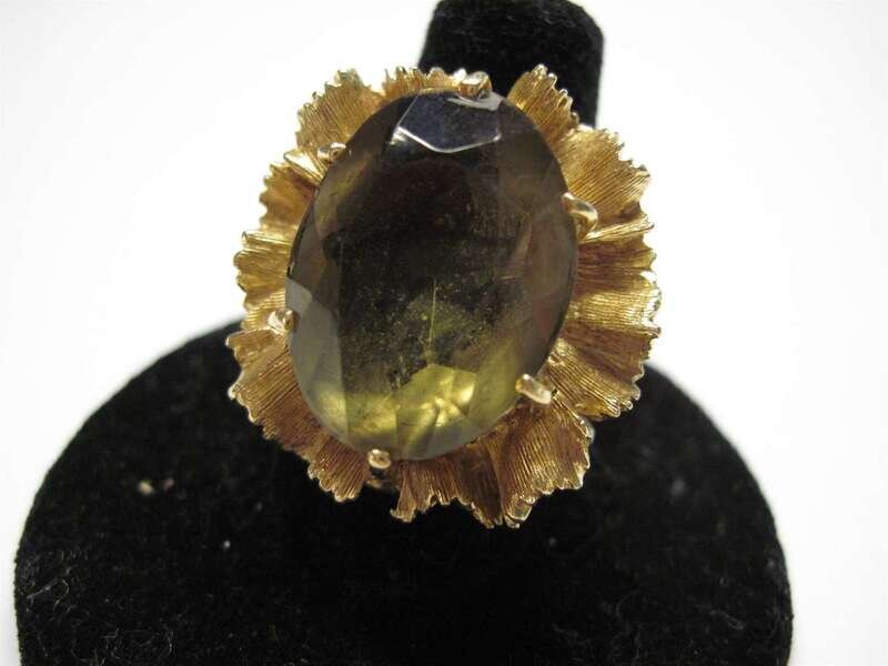 Large oval faceted oval smoky quartz in a "leaf" edge setting.