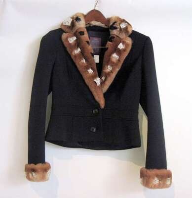 Black tight knit double button blazer, brown rabbit fur blazer and cuffs, interwoven with lace, black silk lining. Us size: 6.