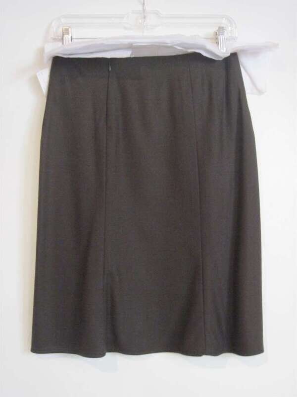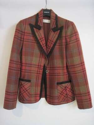 Pumpkin plaid jacket with brown suede trim, single button front, front patch pockets, accompanied by olive tone wool A-line skirt. US size: 4.