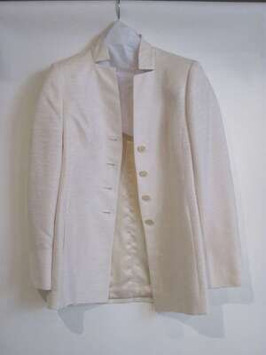 Raw silk long jacket, hits at hip, button down front, with mandarin style collar, accompanied by matching flat front dress pant. US size: 6.