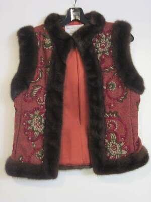 Red Hunter's plaid vest with slight turtle neck, snap front closure, red tone embroidered wool vest with red silk lining and chocolate mink trim, together with classic blue boucle knit vest, grey silk lined.