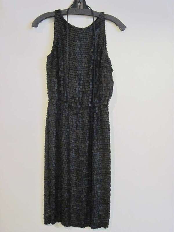 Unusual black leather cut square fish scale design, black leather rope belt. Approximate dress size: US 0.