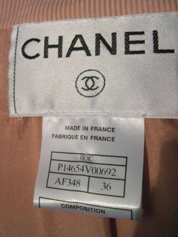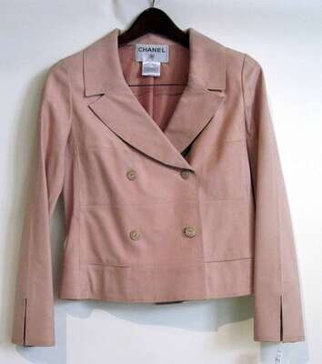 Finely striped light pink double breasted jacket with Chanel logo buttons, hidden front pockets and pink silk lining. Chanel size: 36.