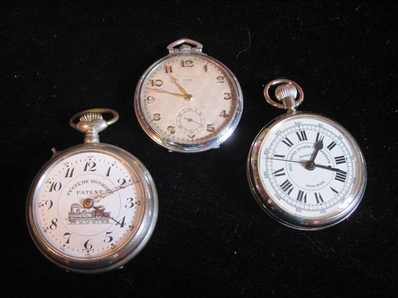 Roxy, gold on white Arabic numeral dial with subsidiary seconds dial, System Roskopf, steam engine engraved on the face, black on white Arabic numeral dial, and Bentima Chronometer, sweep second hand, black on white Roman numeral dial.