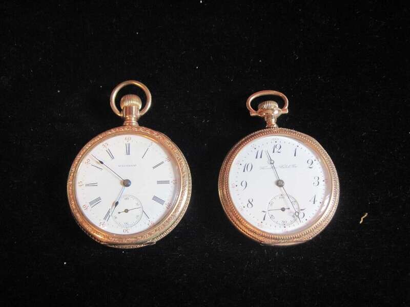 Hamilton Watch Co., black on white Arabic numeral dial with subsidiary seconds dial, No. 366983 and Waltham, black on white Roman numeral dial with subsidiary seconds dial, No. 7552987.