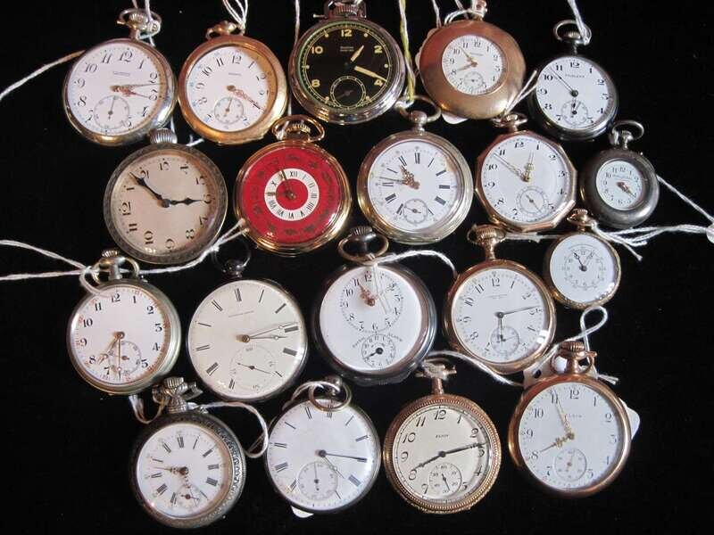 Elgin, No. 23779110, Diam. 13/4 in., (monogramed), Stanffer, Geneva, key wind, Diam. 1 3/4 in. (clasp does not work), no name, pentagonal case, Diam. 1 3/4 in., Swiss alarm, Diam. 1 7/8 in., Westclox, Diam. 1 7/8 in., Theodore H. Starr, New York (retailer), Diam. 1 3/4 in., Swiss, Geneva, Diam. 1 3/4 in., (hinge is bent and lens is off), Waltham, No. 20569341, Diam. 1 3/4 in. (thin), Vigilan (lady's), Diam. 1 1/2 in., Elgin National Watch Co. (lady's), No.117062899, Diam. 1 1/4 in., O.S.K. Fitch, key wind, Diam. 1 3/4 in. (face with enamel losses), No name, Diam. 1 3/4 in., J.S. Garrison, Cape May, N.J. (retailer), fancy hands, Diam. 1 7/8 in., David Humburt, Geneva, No. 28825, key wind, Diam. 1 3/4 in., Elgin, fancy hands, monogram, Diam. 1 7/8 in., eight day travel movement only and porcelain face calendar movement (as is).