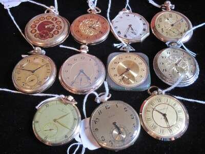 Havila Watch Co., square case, monogram, Size 1 3/4 in. square, no name, gold face, Diam. 1 3/4 in., Huguenin, pentagonal case, Diam. 1 5/8 in., Locust, red dial and center, Diam. 1 7/8 in., Watch Specialties, with 14 karat yellow gold 9 in. chain, Diam. 1 5/8 in.., M Y R Watch Co., open back, Diam.1 3/4 in., Illinois, Diam. 1 5/8 in., Caravele, Diam. 1 5/8 in., Illinois, No. 4563469, Diam. 1 5/8 in., Helbros, Diam. 1 5/8 in. and Elgin, No. 26091058, Diam. 1 5/8 in.