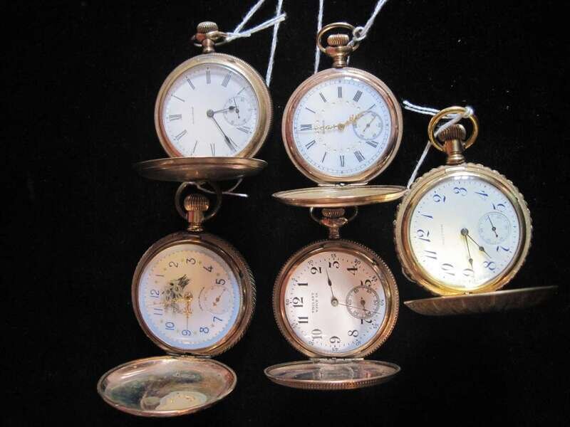 Waltham, black on white Roman numeral dial with subsidiary seconds dial, No. 11459447, Diam. 1 7/8 in., American Waltham Watch Co., blue on white Arabic numeral dial, bunch of daisies and blue about the edge, fancy hands, No. 6571983, Diam. 2 1/8 in., Waltham, blue on white Arabic numeral dial with subsidiary seconds dial, No. 12001535, Diam.2 in., Elgin, black on white Roman numeral dial with subsidiary seconds dial, No.9931707, fancy hands, monogramed, Diam.1 7/8 in. and Vigilant, black on white Arabic numeral dial with subsidiary seconds dial, Diam. 1 7/8 in.