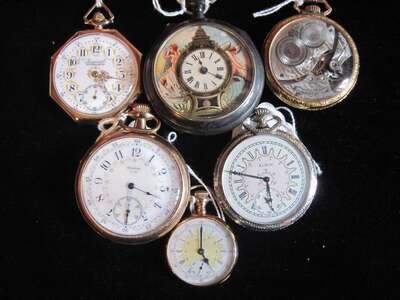 No name, enamel face with two angels beside a clock, has pendulum, Diam. 2 in., Elgin, open back, No. 27661024, Diam. 1 7/8 in., Imperial, decorative face, octagonal case, Diam. 1 5/8 in., Elgin, decorative face, Diam. 2 1/8 in.. Elgin, decorative face, No. 29631835, Diam. 1 3/4 in., Waltham, decorative face, open back, Diam. 1 7/8 in. and Elgin (lady's), decorative face, No. 1213953, Diam. 1 1/4 in.