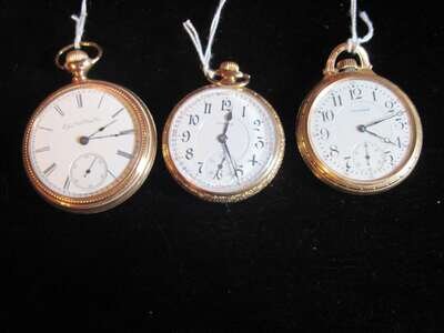 Illinois, open back, black on white Arabic numeral dial with subsidiary seconds dial, No. 4506745, Waltham, black on white Arabic numeral dial with subsidiary seconds dial and Elgin National Watch Co., black on white Roman numeral dial with subsidiary seconds dial, No. 36953.