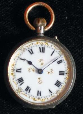 Black on white Roman numeral dial, decorated with gilt edge, chased back.