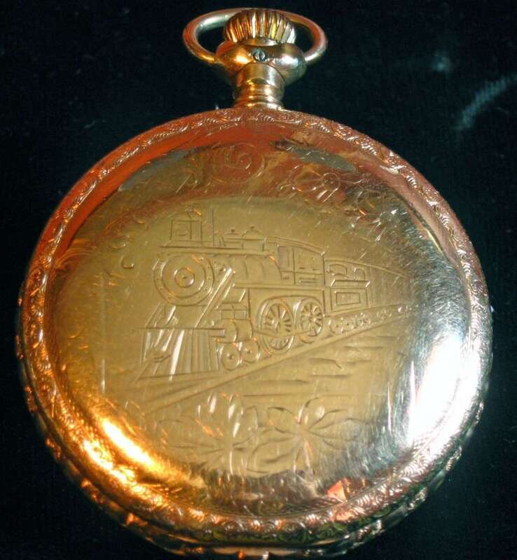 Black on white Roman numeral dial, subsidiary seconds dial, No. 2230735. Back cover engraved with a steam locomotive.