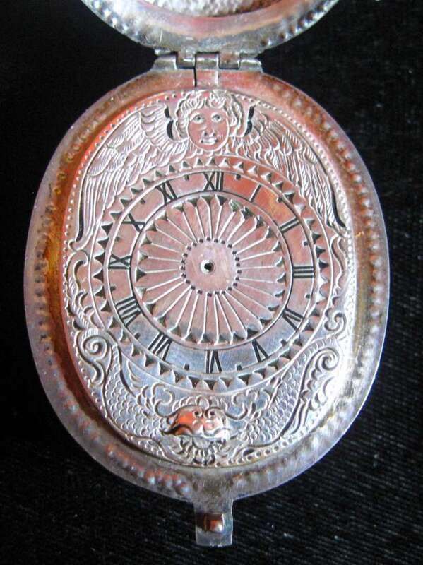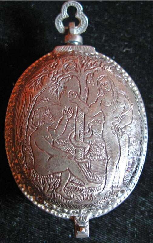 Silver face engraved with an angel, black Roman numeral dial, case engraved with images of Adam and Eve (front) and two figures carrying grapes (back) No. 653.