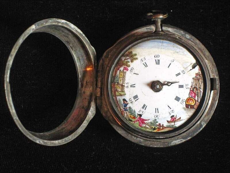 Key wind, black on white Roman numeral dial, enamel border of castle, hunter and ship in port. No. 1385.