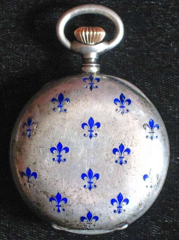 Blue Arabic numeral dial with subsidiary seconds dial. Back of case decorated with fourteen fleur de lis.