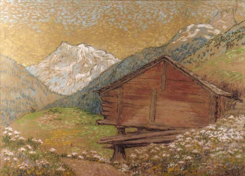 SIR GEORGE CLAUSEN (BRITISH 1852-1944) LOG CABIN IN THE MOUNTAINS