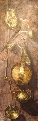 PAUL GORKA (AMERICAN B. 1931) TROMPE L'OEIL WITH SILVER VESSELS AND TOOLS