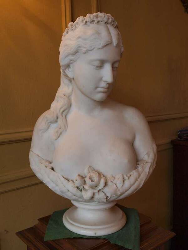 White marble bust of a woman, signed 'E. Thaxter'.
