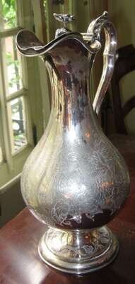 Silverplate ewer with flower finial and grapevine engraving early 20th century