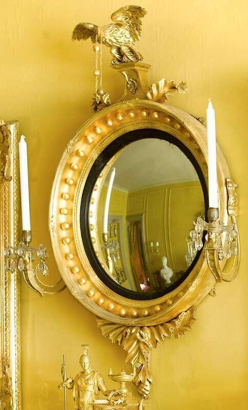 Eagle surmount over a convex plate with ebonized bezel with gilt acorn ball frame, flanked by candle arms.