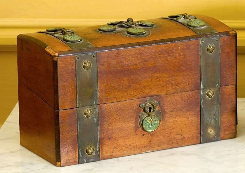 Arts & Crafts walnut, enamel and metal bound stationary box