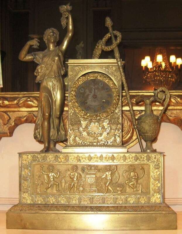 The circular dial with Roman numerals set into an upright rectangular case with cast cornucopiae decoration, flanked by standing figure of a bacchante holding a chalice and a bunch of grapes, on a rectangular base cast with a frieze of putti in revelry.