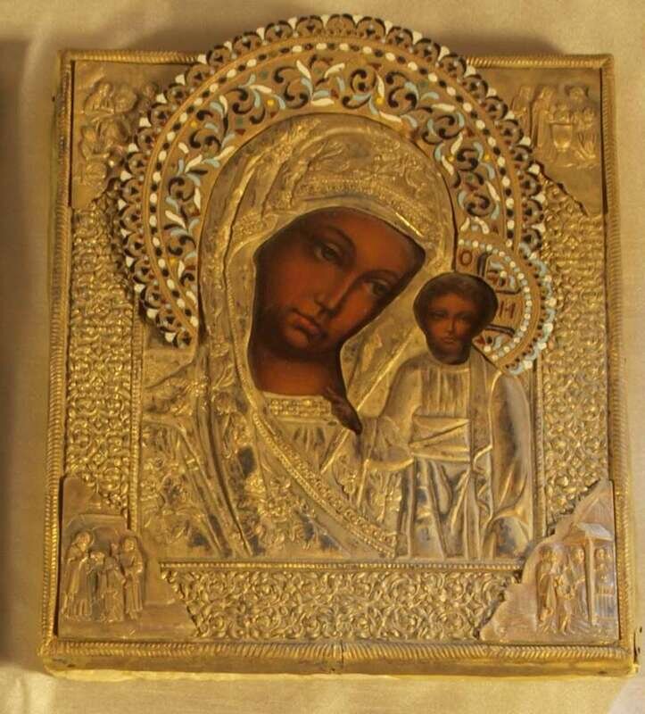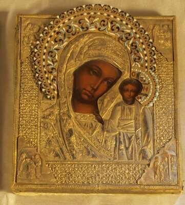 Russian cloisonne and gilt metal icon, the Kazan Mother of God 20th century